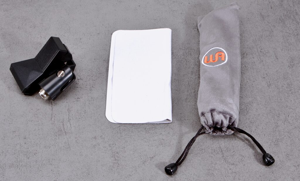 Mit seiner blitzblanken Chromoberfläche zieht das Fen-tone die Blicke auf sich. Aber auch Fingerabdrücke. Bei Warm Audio wusste man sicher ganz genau, was man tat, als man neben der flauschigen Kordeltasche auch ein Poliertuch beigelegt hat. Eine Klemme und ein Plastikcase komplettieren den Lieferumfang.
