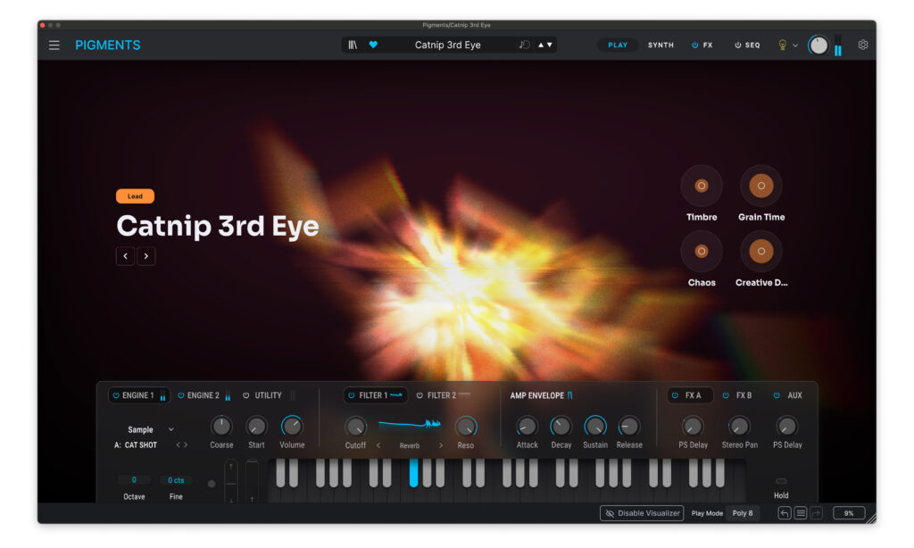 Und der Visualizer? Die Animationen für Pads, Leads und Bässe sehen hervorragend aus. Aber ich bin nicht ganz sicher, für wen der Play-Bereich, respektive diese erweiterten Visualisierungen, gedacht ist. Denn in der DAW verbringt man die meiste Zeit im Synth-Bereich von Pigments oder im Browser und auf der Bühne, falls Pigments über einen Laptop läuft, am besten gar nicht am Bildschirm. Live-Streamer und Content Creator vielleicht? Wird Pigments zum Social-Media-Synth?