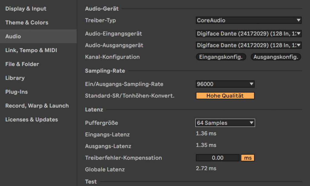 Die Dante-Schnittstelle arbeitet ohne Einschränkungen und unterstützt neben AES67 und ST 2110 auch DDM. Netzwerklatenzen lassen sich zwischen 0,25 und 5 ms wählen, das Samplerate-Angebot umfasst die Standards, auf kinomäßigen Pull-Up muss man verzichten. Die PCM-Übertragung erfolgt in 24 oder 32 Bit, das Clocking über MADI oder Dante.